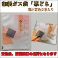 ガスバリア性の高い雲龍和紙のカマス貼り包装袋に茶色の文字で「栗どら」とオレンジと薄いオレンジ色で模様が 印刷されています。 裏面にも文字と模様が印刷されています。 脱酸素剤エージレスと組み合わせることで密閉袋内の酸素を吸収し、一定期間、脱酸素状態を保ちます。